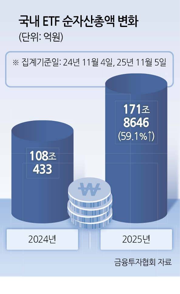 7일 금융투자협회에 따르면 국내에 투자하는 ETF 순자산총액은 지난해 11월 4일 108조433억원에서 올해 같은 날 기준 171조8647억원으로 63조8214억원(59.1%) 늘었다.