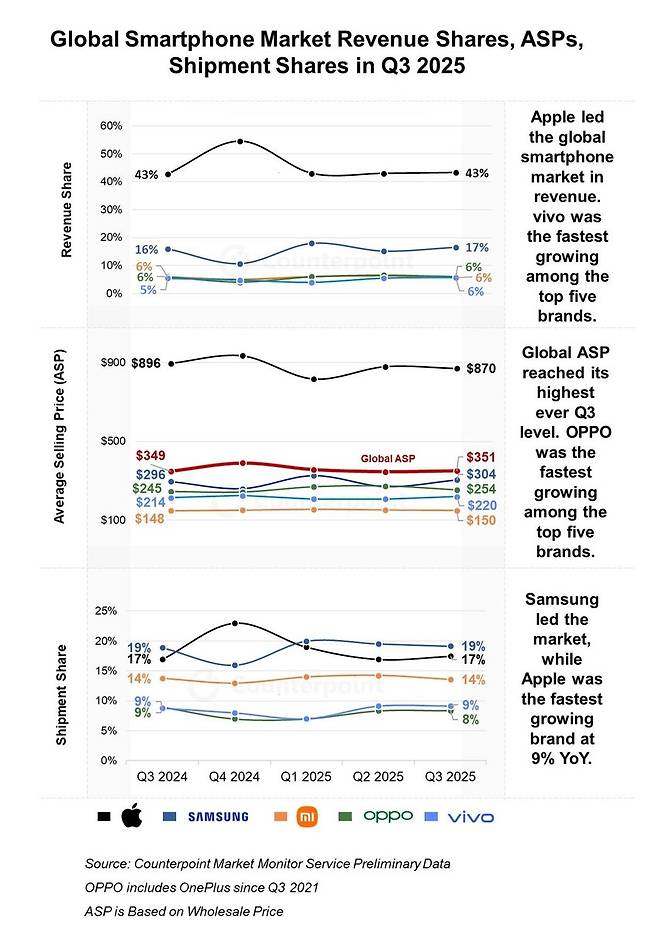 올해 3분기 전 세계 스마트폰 매출이 지난해 같은 기간보다 5% 증가한 1천120억달러(한화 약 162조9천152억원)로, 분기 기준 역대 최고치를 기록했다고 시장조사업체 카운터포인트리서치가 7일 밝혔습니다.