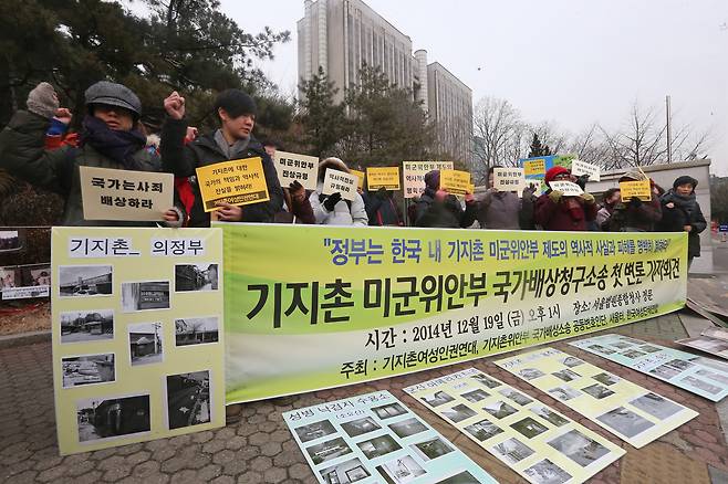 | ▲ 2014년 12월 19일 서초동 서울 중앙지법 앞에서 열린 '기지촌 미군위안부 국가배상청구소송 첫 변론 기자회견'에서 참가자들이 구호를 외치고 있다. |