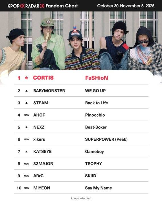 이번 주 케이팝레이더가 발표한 위클리 팬덤 차트 TOP 10에는 코르티스의 뒤를 이어 베이비몬스터 '위 고 업(WE GO UP)'이 2위, 앤팀 '백 투 라이프(Back to Life)'가 3를 기록했다. 또한, 아홉, 싸이커스, 82메이저, 아크, 미연 등이 순위에 새롭게 이름을 올렸다.
