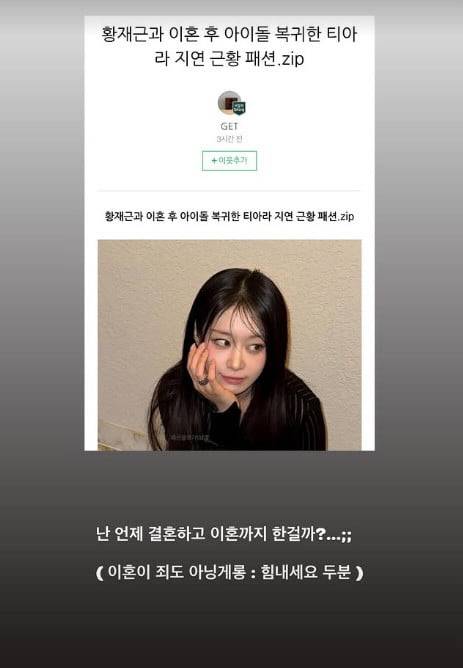 공개된 사진 속에는 한 블로거가 작성한 '황재근과 이혼 후 아이돌 복귀한 티아라 지연 근황·패션'이라는 제목의 게시물이 담겨 있다.