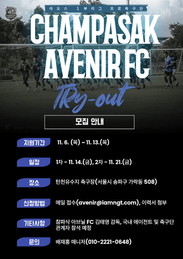 이번 트라이아웃에는 참파삭 아브닐 FC의 김태영 감독을 비롯해, 국내 에이전트 및 프로구단 관계자들이 직접 참석해 참가자들의 기량을 평가한다.