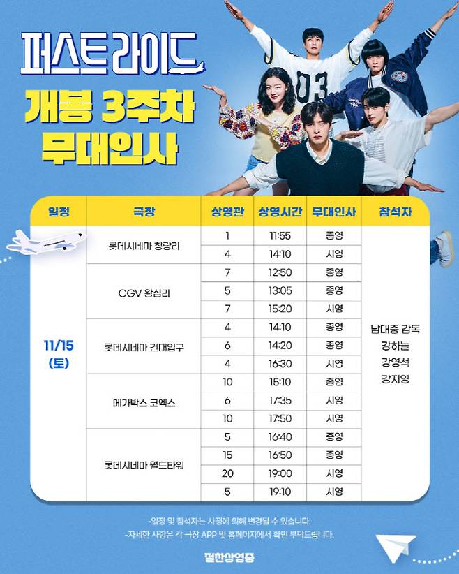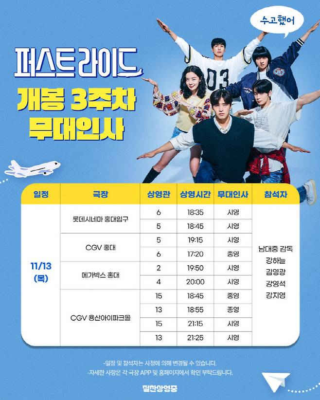 먼저 13일에는 강하늘, 김영광, 강영석, 강지영, 남대중 감독까지 개봉 전부터 열혈 홍보를 이어 간 '퍼스트 라이드'의 주역들이 다시 한번 뭉쳐 무대인사를 진행한다.