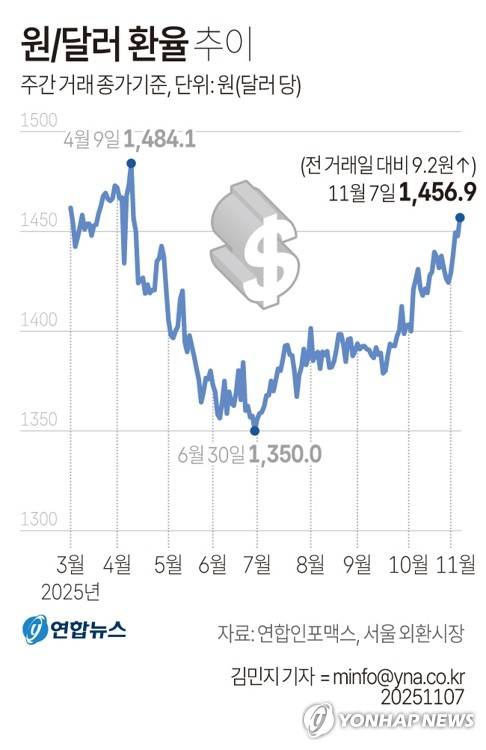 (서울=연합뉴스) 김민지 기자 = 7일 서울 외환시장에서 미국 달러화 대비 원화 환율의 주간 거래 종가(오후 3시 30분 기준)는 전일보다 9.2원 오른 1,456.9원이다.