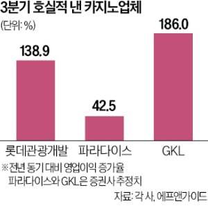 7일 관광업계와 증권업계에 따르면 국내에서 외국인 대상 카지노를 운영하는 롯데관광개발, 파라다이스, GKL의 3분기 영업이익 합산액은 1212억원으로 추산됐다. 지난해 3분기(642억원) 대비 두 배 가까이 늘어난 금액이다.
