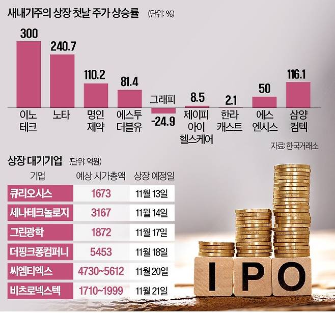 공모주 시장이 활기를 되찾고 있다. 증시에 입성한 새내기 종목 주가가 줄줄이 급등하면서다. 상장 첫날 ‘따따블’(공모가 대비 4배 상승)을 달성하는 사례까지 나왔다. 연말까지 공모주 시장이 활황세를 이어갈 가능성이 높다는 게 증권업계 설명이다.
