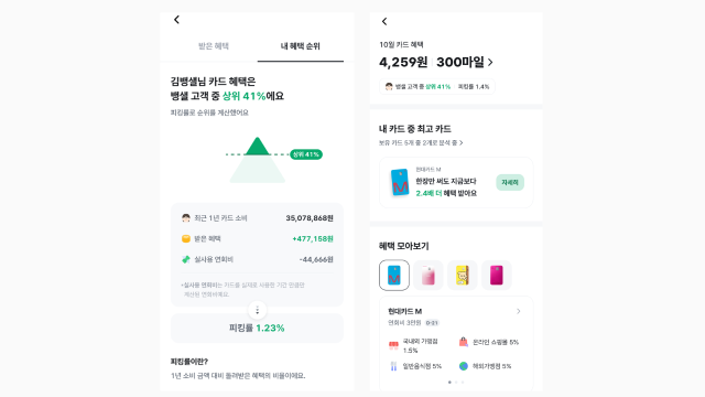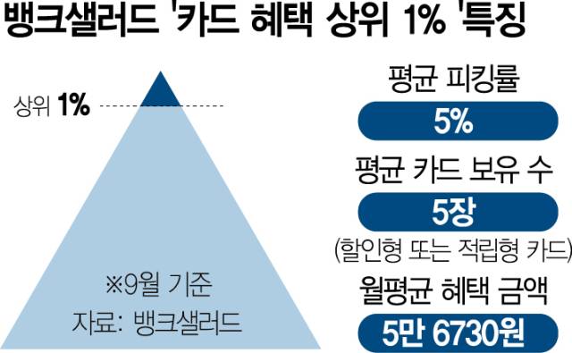 상위 1% 고객들의 평균 피킹률은 5% 수준이며 이들은 약 5만 6000원의 혜택을 받았다. 이들은 평균 5개의 카드를 사용하며 주로 할인형 또는 포인트 적립형 카드를 활용하는 경향을 보였다. 또 상위 1% 고객군의 평균연령은 37.1세이며 여성보다는 남성이 피킹률 등 혜택에 대한 관심을 더 보였다.
