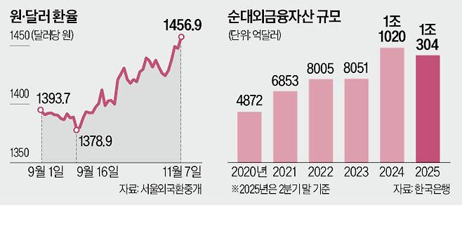 한국은행에 따르면 한국의 순대외금융자산 규모는 지난 2분기 말 기준 1조304억달러로 집계됐다. 작년 말(1조1020억달러)보다는 소폭 줄었지만 2023년 말(8051억달러)보다는 27.9%, 2020년(4872억달러)보다는 2.1배 증가했다. 관련 보고서를 쓴 이희은 한은 과장은 “순대외자산 증가는 자본의 해외 유출에 따른 국내 자본시장 투자 기반 약화, 달러 수요 증가에 따른 원화 약세 압력 등 부정적 측면이 있다”고 설명했다.