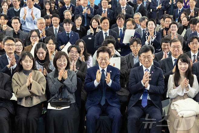 (서울=뉴스1) 이재명 기자 = 이재명 대통령이 7일 대전 유성구 국립중앙과학관에서 열린 다시 과학기술인을 꿈꾸는 대한민국 국민보고회에서 참석자들과 함께 기념촬영을 하고 있다. (대통령실 제공. 재판매 및 DB 금지) 2025.11.7/뉴스1