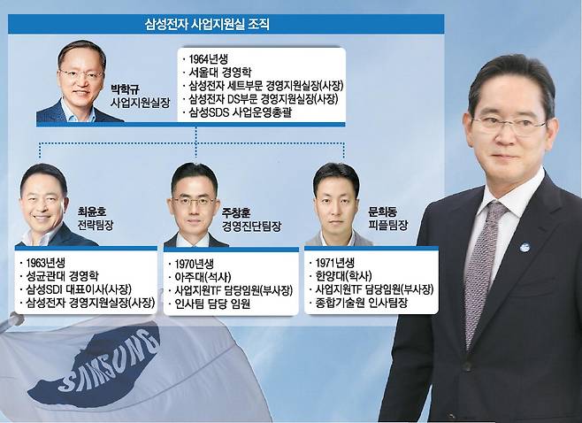 삼성전자 인사팀을 거쳐 사업지원TF에 합류한 주창훈 부사장은 사업지원실 경영진단팀장으로 임명됐다. 삼성종합기술원 인사팀장 출신인 문희동 부사장은 사업지원실 피플팀장으로 임명됐다.