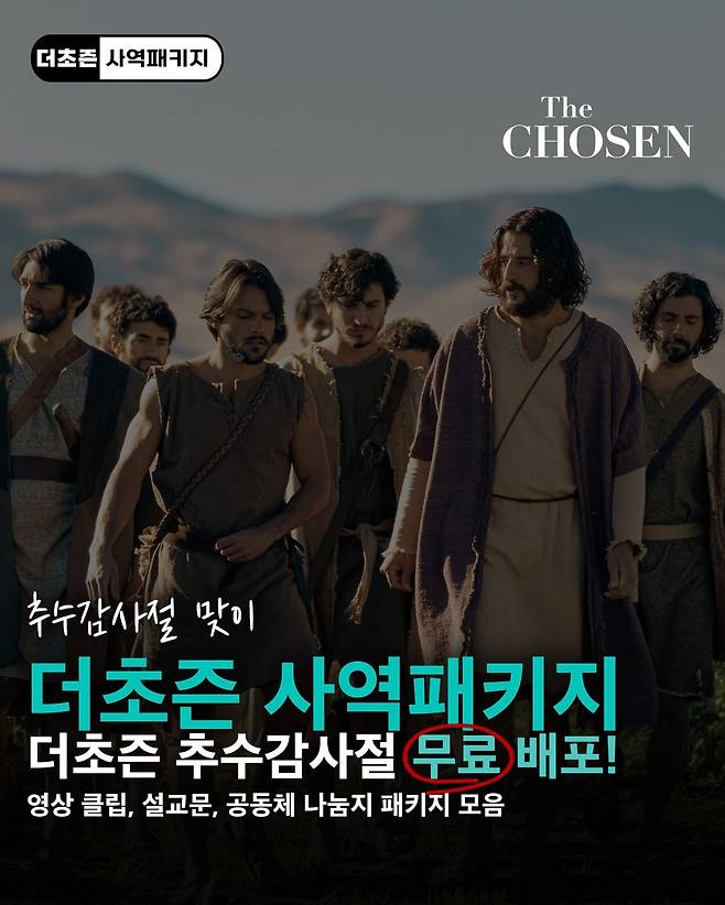 전 세계적으로 2억8000여만명이 시청한 기독 드라마 ‘더 초즌(The Chosen)’이 한국교회 사역에 활용될 수 있도록 무료 배포를 시작했다. ‘더 초즌’ 한국지부는 추수감사절을 앞두고 5분가량의 영상 클립과 설교문, 나눔지를 포함한 패키지를 구성해 7일 공개했다.