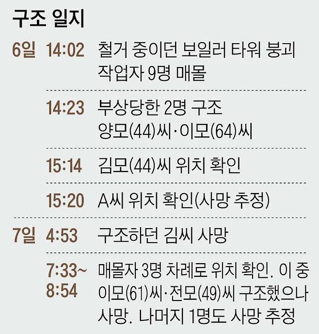 전날 사고 직후 구조된 작업자들도 사고 당시 충격이 가시지 않은 상태다. 사고 당시 지상에서 사다리차를 조종하고 있던 양씨는 온몸에 타박상을 입고 병원으로 이송됐다. 생명에 지장은 없는 상태지만 트라우마를 호소하고 있다. 가족도 면회를 하지 못하고 있다고 한다. 양씨는 사고 직후 “작업자들을 구조물 위에 올려주고 돌아섰는데 곧 이어 무너져내렸다”고 진술했다고 한다.