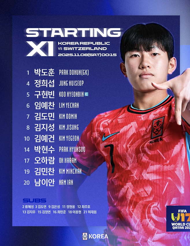 한국 17세 이하(U-17) 대표팀은 8일 오전 0시 15분(한국시간) 카타르 도하 아스파이어존 피치4에서 열린 ‘국제축구연맹(FIFA) U-17 월드컵 카타르 2025’ F조 조별리그 2차전에서 스위스와 0-0으로 비겼다.