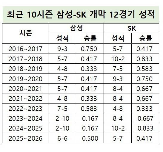 2016~2017시즌부터 이번 시즌까지 10시즌 동안 삼성이 12경기 기준 5할 이상 승률을 기록한 건 2016~2017시즌(9승 3패)과 2022~2023시즌(7승 5패)에 이어 이번이 3번째다.
