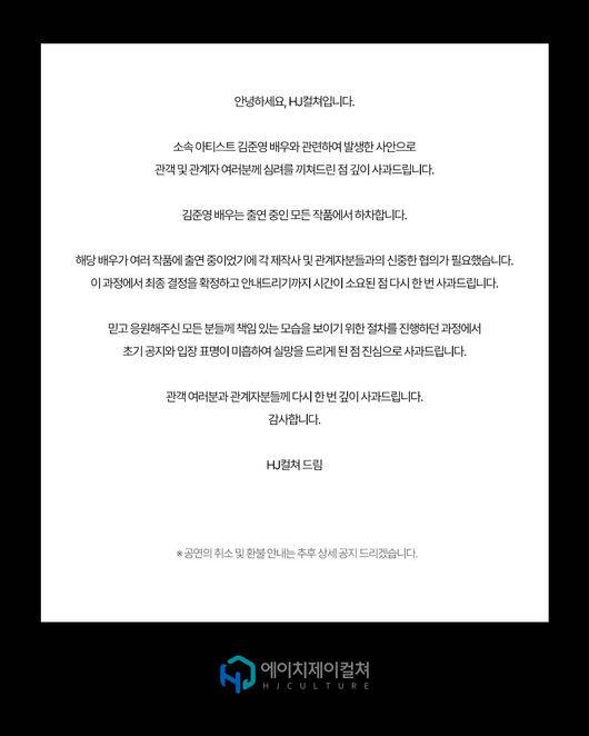 이와 관련해 김준영 역시 “저로 인해 피해를 입은 제작사, 소속사, 관계자분들, 배우분들, 스태프분들께도 고개숙여 사과드란다. 정말 죄송하다”며 “관객분들과 늘 부족한 저를 응원해 주셨던 팬분들께 상처와 실망감을 드려 너무 죄송하다. 부족한 저에게 과분한 사랑과 관심을 주셨는데 그에 합당한 행동을 하지 못하고 저의 잘못된 행동으로 상처를 드렸다”고 말했다.