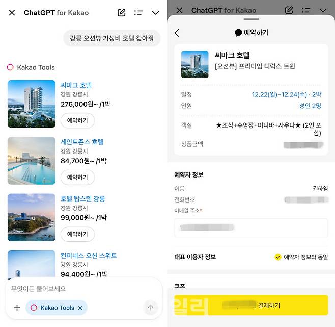 이번에는 카카오 툴즈를 활성화한 상태로 동일한 질문을 던져봤다. 그러자 강릉 소재 주요 호텔 이름과 1박당 가격 정보가 각각 ‘예약하기’ 버튼과 즉각 제시됐다. 호텔마다 정보를 확인해보고 마음에 드는 곳 하나를 골라 ‘예약하기’를 눌렀더니, 곧장 ‘카카오톡 예약하기’ 서비스와 연동돼 일정·인원·객실 선택 화면이 뜨고 카카오페이 결제까지 한 번에 이뤄졌다.