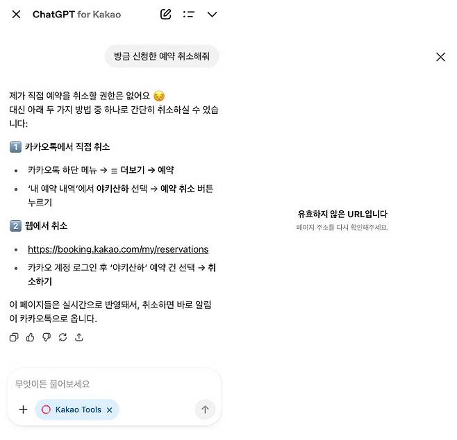 혹시 예약한 식당 정보를 단체 채팅방에 공유하는 것도 AI가 대신 해줄까? 아쉽게도 그러진 못 했다. 사용자가 예약하기 서비스 내 공유하기 버튼을 직접 눌러야 했다. 예약을 취소하고 싶다고 하니, AI가 직접 예약 취소 권한은 없다며 엉뚱한 링크를 보내주기도 했다. 웹에서 취소할 수 있다며 AI가 안내해준 URL 주소를 누르자 ‘유효하지 않은 URL입니다’라는 메시지만 반복됐다.