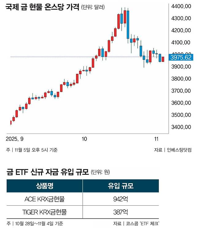 실제로 투자자들은 조정 국면을 활용해 적극적인 금 매입에 나서고 있다. 코스콤 'ETF 체크'에 따르면 최근 일주일(10월 28일~11월 4일) 동안 원자재 부문 상장지수펀드(ETF) 가운데 가장 많은 신규 자금이 유입된 상품은 'ACE KRX금현물'이었다(표 참조). 유입 규모는 942억 원에 달했다. ' TIGER KRX금현물'이 387억 원으로 뒤를 이었다. 10월 28일 'ACE KRX금현물'과 ' TIGER KRX금현물'은 모두 고점 대비 20%가량 떨어진 상태였다.한편 영국 '파이낸셜타임스(FT)'는 고평가 우려를 받는 미국 뉴욕증시가 약세장으로 전환하면 금값이 추가로 내릴 가능성이 있다고 경고하기도 했다. FT는 10월 23일(현지 시간) '주식 헤지 수단으로서 금은 인내심을 필요로 한다' 제하의 기사에서 "증시가 하락세를 타면 투자자들은 현금 보유를 우선시하고 가능한 한 모든 자산을 매도하려 하기 때문에 금도 며칠 내지 몇 주 동안 '처분 흐름'에 휘말리게 된다"며 "금값이 올해만 57% 이상 급등하면서 이런 위험이 상대적으로 더 커졌다"고 분석했다. 그러면서 "주식과 동반 하락한 뒤 디커플링을 거쳐 상승하는 금의 포트폴리오상 이점을 누리고 싶은 투자자라면 인내심을 가져야 한다"고 덧붙였다. 뉴욕증시 3대 지수는 11월 4일(현지 시간) 팔란티어발(發) 인공지능(AI) 거품론이 확산하며 일제히 하락 마감했다.
