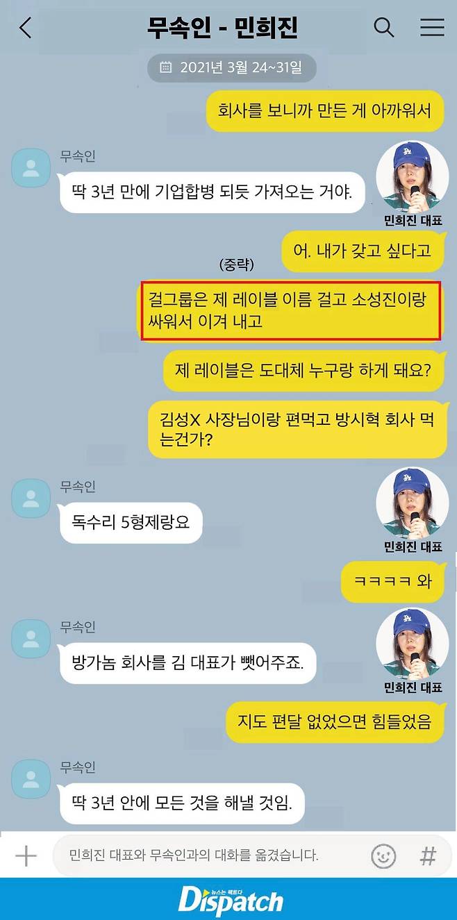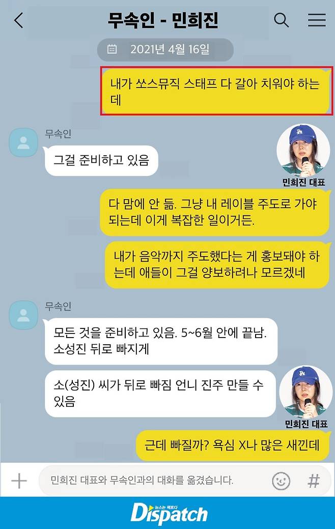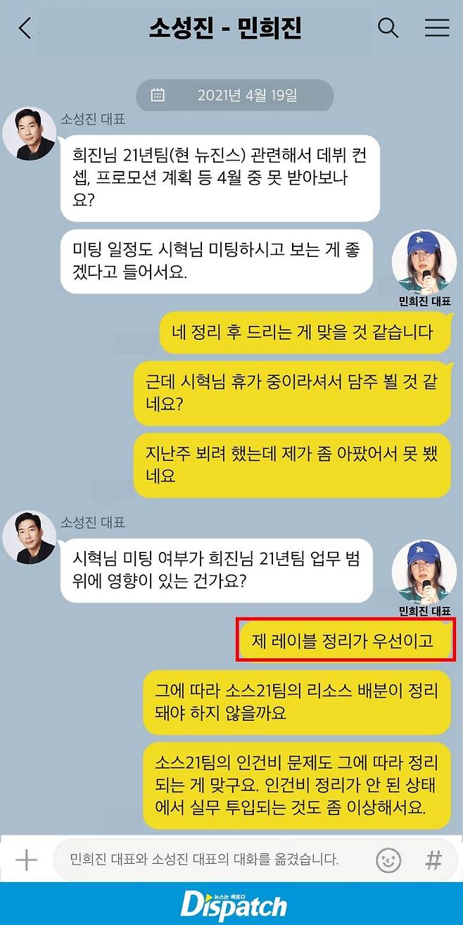 하지만 민희진은 "제 레이블 정리가 우선이다. 그에 따라 S21 팀(뉴진스 데뷔 프로젝트) 리소스 배분이 정리돼야 한다"고 답했다.