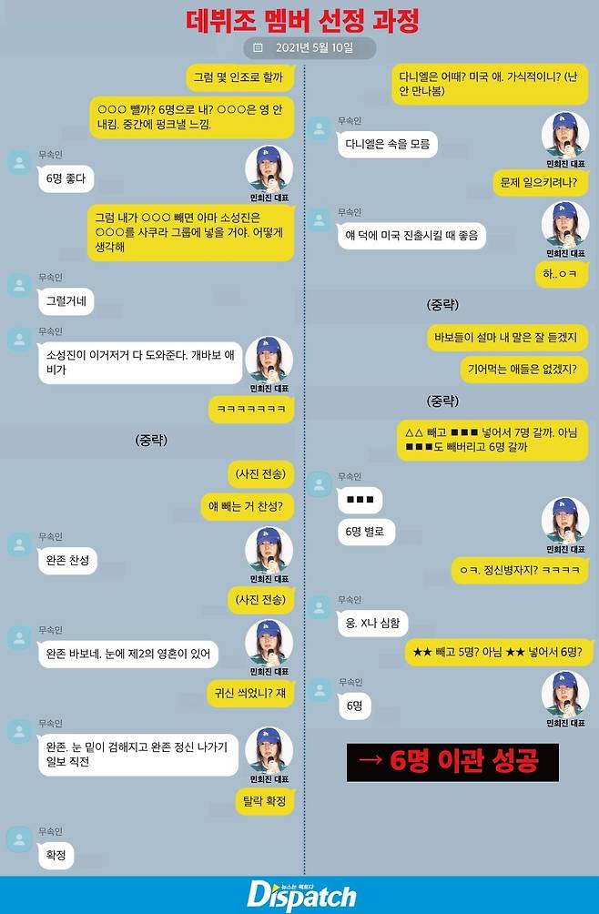민희진: 민희진이 2019년 하이브 CBO(최고 브랜드 책임자)가 된 이후 언론에 '민희진 디렉팅 걸그룹이 하이브 첫 번째 걸그룹으로 나올 것'이라고 보도됐다. 멤버들도 당연히 같은 기대감을 안고 합류했다. 실제로 데뷔 준비 역시 이뤄졌다.