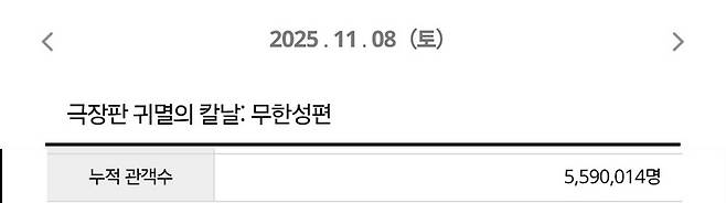 '귀멸의 칼날: 무한성편'의 다음 목표는 올해 전체 박스오피스 1위다. 올해 최고 스코어를 기록한 영화는 조정석 주연의 '좀비딸'(5,636,018명)이다. 559만 명을 돌파하며 바짝 추격 중인 '귀멸의 칼날: 무한성편'은 무서운 뒷심으로 여전히 상영관을 지키고 있어 어떤 기록으로 흥행 질주를 마무리할지 귀추가 주목된다.