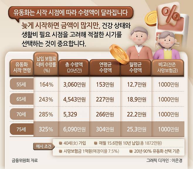 구체적인 예를 들어보겠습니다. 한 여성 소비자가 40세에 가입해 매월 15만6000원의 보험료를 10년 동안 총 1872만원을 납입한 사망보험금 1억원 보험계약(예정이율 7.5%)을 보유하고 있다고 해봅시다. 그가 20년 동안 90% 유동화를 선택해 55세부터 연금을 받으면 월평균 12만7000원(총 3060만원)과 1000만원의 사망보험금을 받을 수 있습니다.