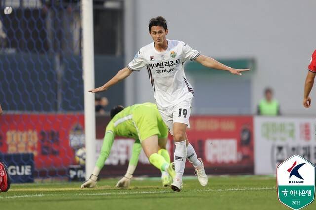 김천의 공격을 막아낸 강원은 전반 30분 선제골을 터뜨렸다. 이유현이 후방에서 길게 때려넣은 볼을 이상헌이 골라인 가까운 지점에서 잡아 중앙으로 연결했다. 골문 가까이 서 있던 박상혁이 밀어넣으며 득점에 성공했다.