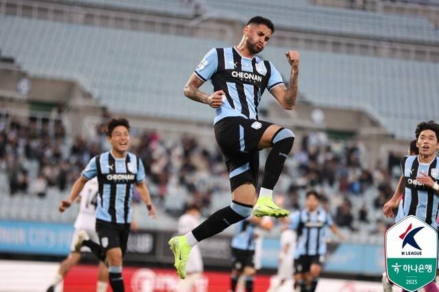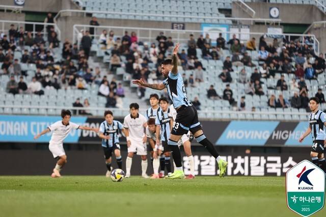천안은 전반 22분 이예찬의 슈팅이 나왔다. 전반 26분 성남 미드필더 프레이타스가 페널티 박스 안에서 상대 선수를 마크하다 공이 팔에 닿으며 핸드볼 파울로 페널티킥을 내줬다. 키키로 나선 브루노가 성공시키며 천안이 1-0으로 앞서 나갔다.