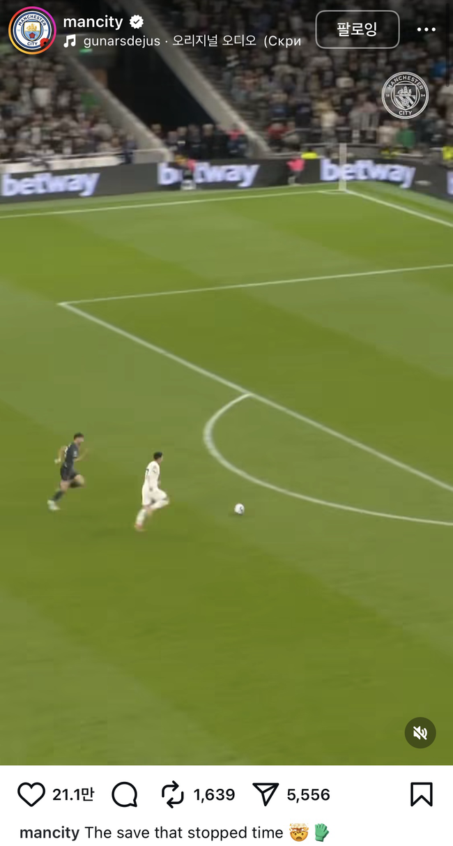 맨시티는 6일 공식 SNS를 통해 손흥민의 슈팅을 오르테가가 선방하는 장면, 그 상황을 바라보는 펩 과르디올라 감독의 표정이 담긴 영상을 공유했다.