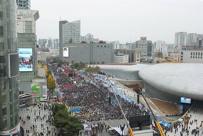 | ▲ .8일 서울 중구 동대문역사문화공원 인근 장충단로에서 전국민주노동조합총연맹이 연 전국노동자대회가 열리고 있다. |