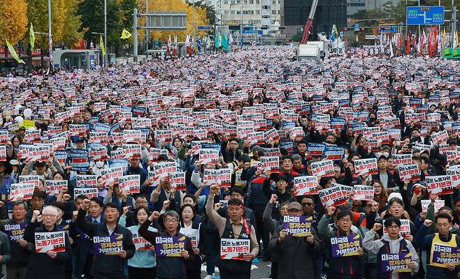 | ▲ 8일 서울 중구 동대문역사문화공원 인근 장충단로에서 전국민주노동조합총연맹이 연 전국노동자대회 참석자들이 구호를 외치고 있다. 2025.11.8 |