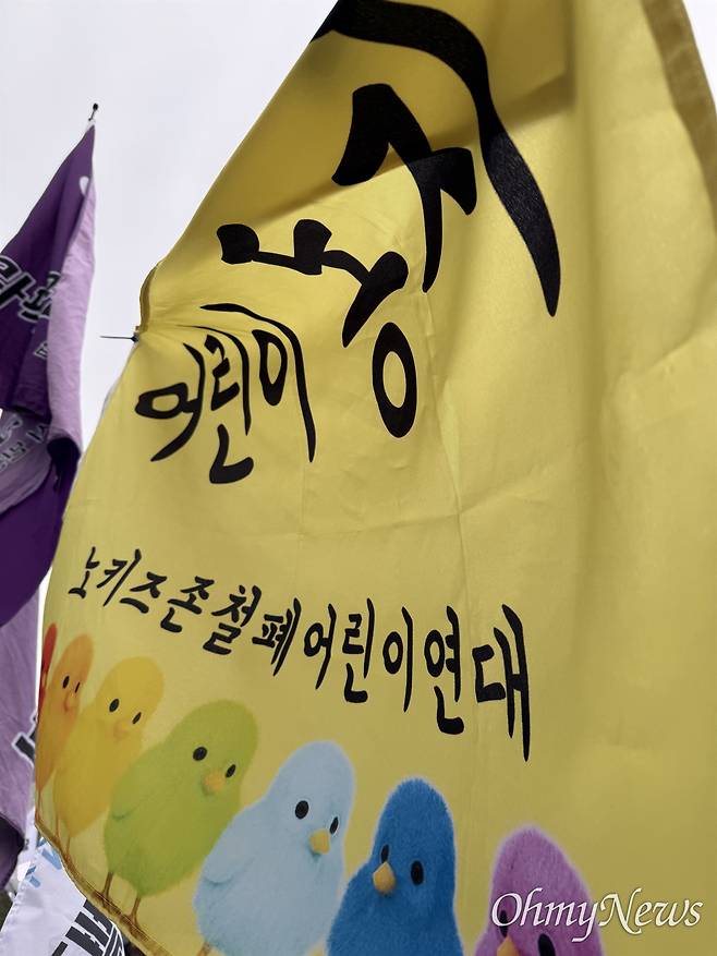 | ▲ 전국민주노동조합총연맹이 8일 연 전국노동자대회에서 한 참석자가 '노키즈존차별철폐연대' 깃발을 선보이고 있다. |
