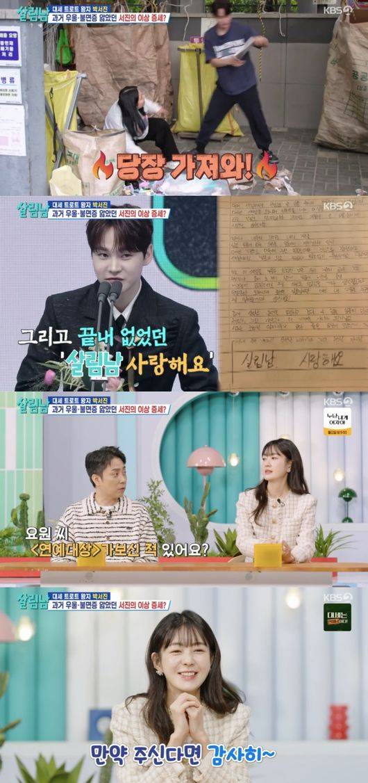 이날 박효정은 쓰레기 분리수거르 하다 작년 박서진의 수상소감을 적은 노트를 발견했다. 박효정은 “함 보자. 이미 지나갔다”라고 했지만, 박서진은 급히 티셔츠 안으로 숨겼다.