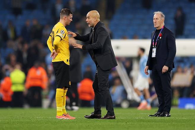 글로벌 축구 매체 '트리뷰나'는 8일(한국 시각) "과르디올라 감독이 4-1로 승리한 후 도르트문트 선수에게 전술 조언을 전달하기 위해서 경기장으로 달려갔다"라며 "과르디올라 감독은 맨시티 선수들을 축하하는 게 아닌, 파스칼 그로스(34·도르트문트)와 대화를 나누기 위해서 뛰어갔다"라고 이야기를 전했다.