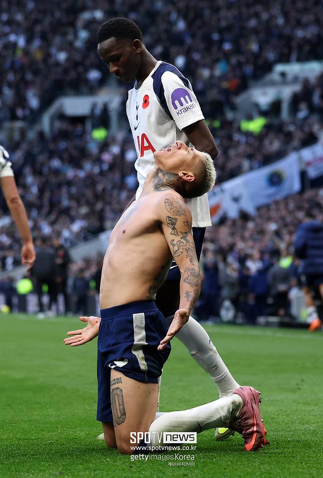 "히샬리송 상의탈의→5분 뒤 눈물" 손흥민 730억 대체자 터졌지만 토트넘 또 '극장 멘붕'…맨유와 혈전 끝 2-2 무승부