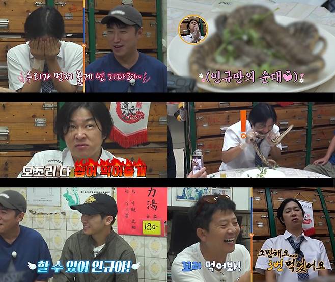 만족스럽게 식사를 마친 ‘독박즈’는 ‘최다 독박자’ 벌칙을 수행하기 위해 ‘통 뱀찜’을 파는 식당으로 이동했다. 이곳 사장님은 “뱀 요리가 남자 스테미너에 좋다”고 ‘강추’했지만, 홍인규는 충격적인 비주얼의 ‘통 뱀찜’을 보고는 혼절 직전까지 갔다. 그럼에도 그는 “이건 순대다”라며 자기 최면을 걸어 먹방을 시도했다.