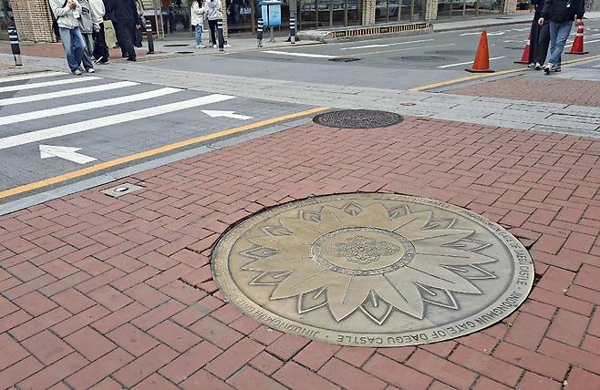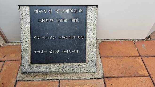 달구벌대로 인도 위에 세워져 있는 '최제우 순도비'와 그 20m 옆 '관덕당(최제우 처형지) 터'를 본 다음 본격적으로 대구읍성 둘래길 답사가 시작되었다. 이곳이 출발점으로 선택된 것은 대구읍성의 정문(남문)인 영남제일관 터와 인접해 있다는 장점 덕분이다. 아무래도 정문을 먼저 보아야 할 것이고, 반월당은 대구의 교통 종심지이기도 하다.