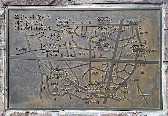 | ▲ 대구읍성 지도(대구역 건너편 대우빌딩 옆 대구읍성 모형에 게시되어 있는 부조) |