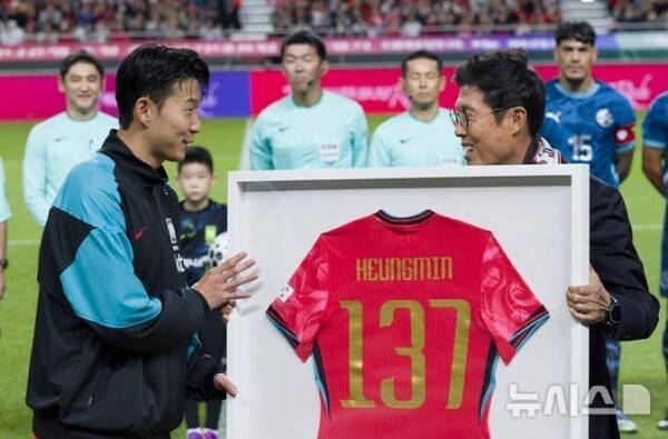 경기 시작 전 차범근 전 감독은 손흥민에게 A매치 최다 출전을 기념하는 유니폼을 전달했다.