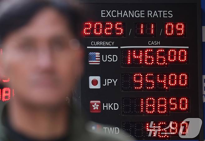 (서울=뉴스1) 황기선 기자 = 원·달러 환율이 7개월 만에 1460을 돌파한 가운데 9일 서울 중구 명동의 한 환전소 앞 전광판에 환율이 표시되고 있다. 2025.11.9/뉴스1