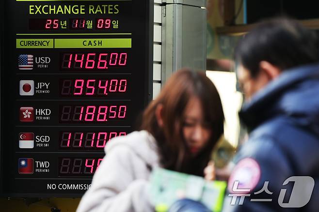 (서울=뉴스1) 황기선 기자 = 원·달러 환율이 7개월 만에 1460을 돌파한 가운데 9일 서울 중구 명동의 한 환전소 앞 전광판에 환율이 표시되고 있다. 2025.11.9/뉴스1