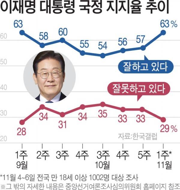 9일 한국갤럽에 따르면 지난 4~6일 전국 만 18세 이상 유권자 1002명을 대상으로 이 대통령의 직무 수행에 대해 물은 결과 ‘잘하고 있다’는 긍정평가는 63%로 집계됐다. 이는 직전 조사보다 6%포인트 상승한 수치다. 앞서 이 대통령 지지율은 지난 9월 3주차 조사에서 60%를 기록한 이후 50%대에 머물렀으나 한 달 반 만에 60%대에 복귀했다.