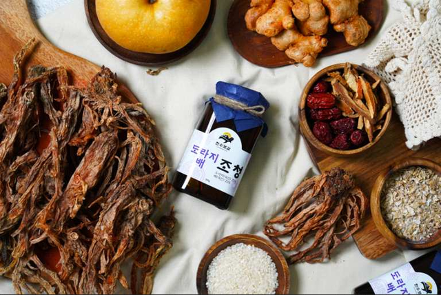 100%국산 4년생 약도라지를 국내유일 1천시간 햇볕과 바람으로 건조하는 자연건조 방식으로 말려, 도라지 특유의 쓰고 아린맛을 없애고 사포닌 성분이 약 5배를 증가되는 천수보감의 특별한 방식으로 도라지조청을 만들고 있다.
