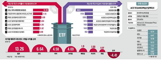 미국 대표지수 상품인 ‘TIGER 미국S&P500’(962억원)과 금현물 ETF ‘ACE KRX금현물’(565억원)은 각각 순매수 7위와 10위에 올랐다.
