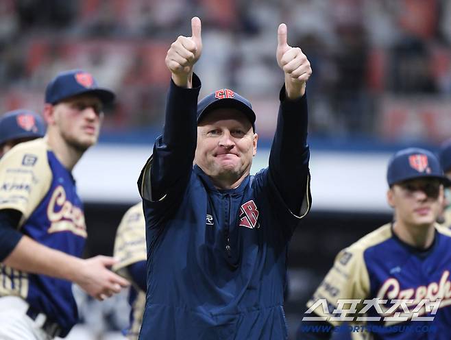 9일 서울 고척스카이돔에서 열린 한국과 체코의 야구대표팀 평가전에서 한국이 11대1로 승리했다. 체코 하딤 감독이 응원을 보내 준 팬들을 향해 엄지를 들고 있다. 고척=정재근 기자 cjg@sportschosun.com/2025.11.9/