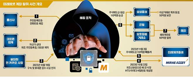 해킹을 통해 계좌 소유자도 모르는 사이 110억원 상당의 주식(현재 시가 기준)과 현금이 다른 계좌로 빠져나가는 일이 미래에셋증권에서 발생했다. SM엔터테인먼트 시세조종 사건으로 법정 구속됐던 배재현 전 카카오 투자총괄대표(사장)가 피해 당사자다. 해킹 조직은 계좌에서 돈이 빠져나가도 대응할 수 없는 자산가를 겨냥했다. 군에 있던 방탄소년단(BTS) 멤버 정국, 수감 중이던 이동채 에코프로 회장도 표적이 된 것으로 전해졌다.