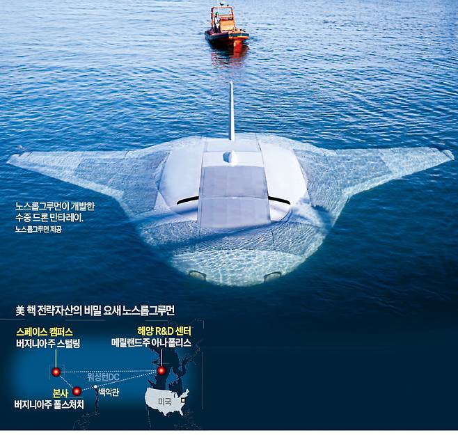 미국 워싱턴DC에서 서쪽으로 차를 타고 한 시간을 달리면 나오는 인구 1만5000여 명의 소도시 폴스처치는 미국 핵 안보의 심장부로 불린다. 철저히 베일에 가린 미국 방위산업 기업 노스롭그루먼의 본사가 둥지를 틀고 있다. 미국 방위산업 3강으로 불리는 노스롭그루먼이 이곳에서 개발한 세계 최초의 조립식 초대형 수중 드론 ‘만타레이’는 향후 핵잠수함을 대체할 수 있는 ‘바다의 암살자’이자 도널드 트럼프 대통령이 추진하는 미국 방산 업그레이드의 상징이다.