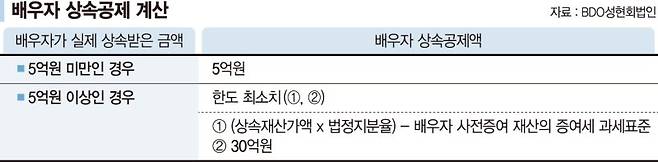 A. 9일 BDO성현회계법인에 따르면 배우자와 자녀가 상속인인 경우에는 상속재산 10억원까지는 상속세 부담이 없다. 일괄공제 5억원과 배우자공제 5억원이 최소한으로 적용되기 때문이다.