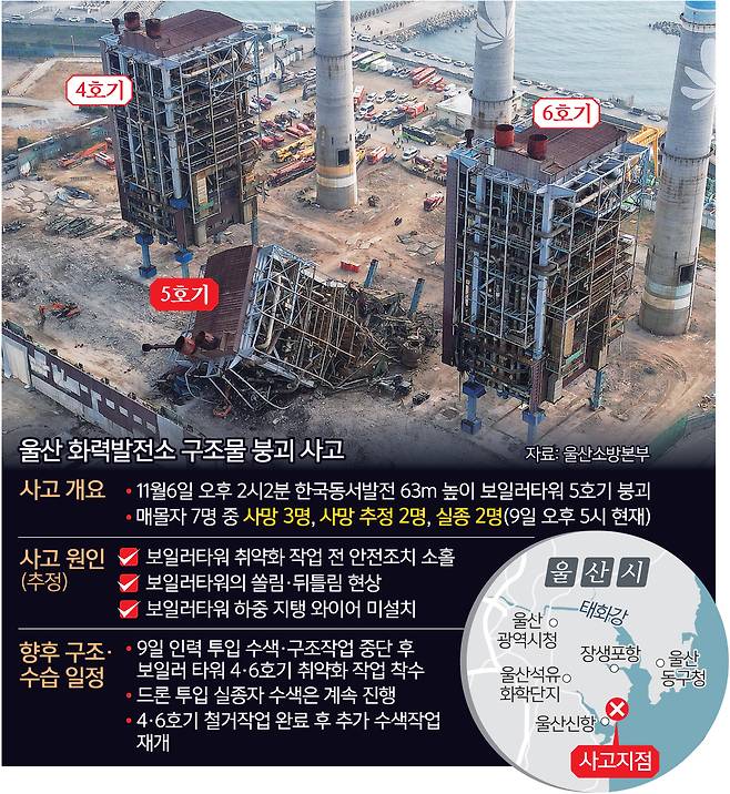 한국동서발전 울산화력발전소 보일러타워 5호기 붕괴 사고 발생 나흘째인 9일 사고 원인 및 책임자 규명을 위한 당국의 조사도 본격화하고 있다.