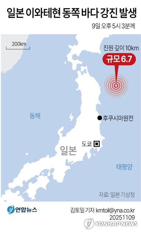 (서울=연합뉴스) 김토일 기자 = 일본 이와테현 동쪽 바다에서 9일 오후 5시 3분께 규모 6.7의 지진이 발생, 이와테현 해안가에 쓰나미 주의보가 내려졌다.